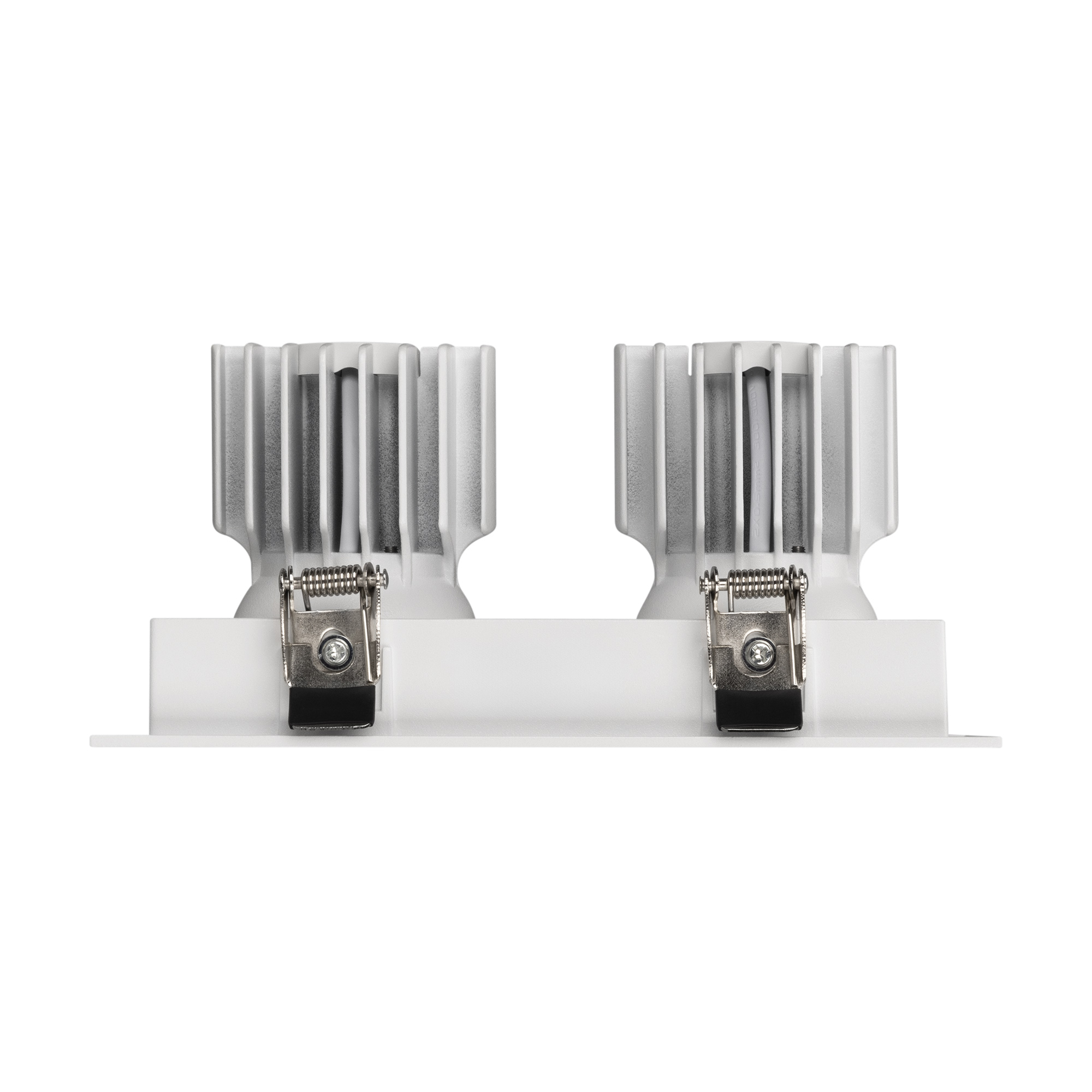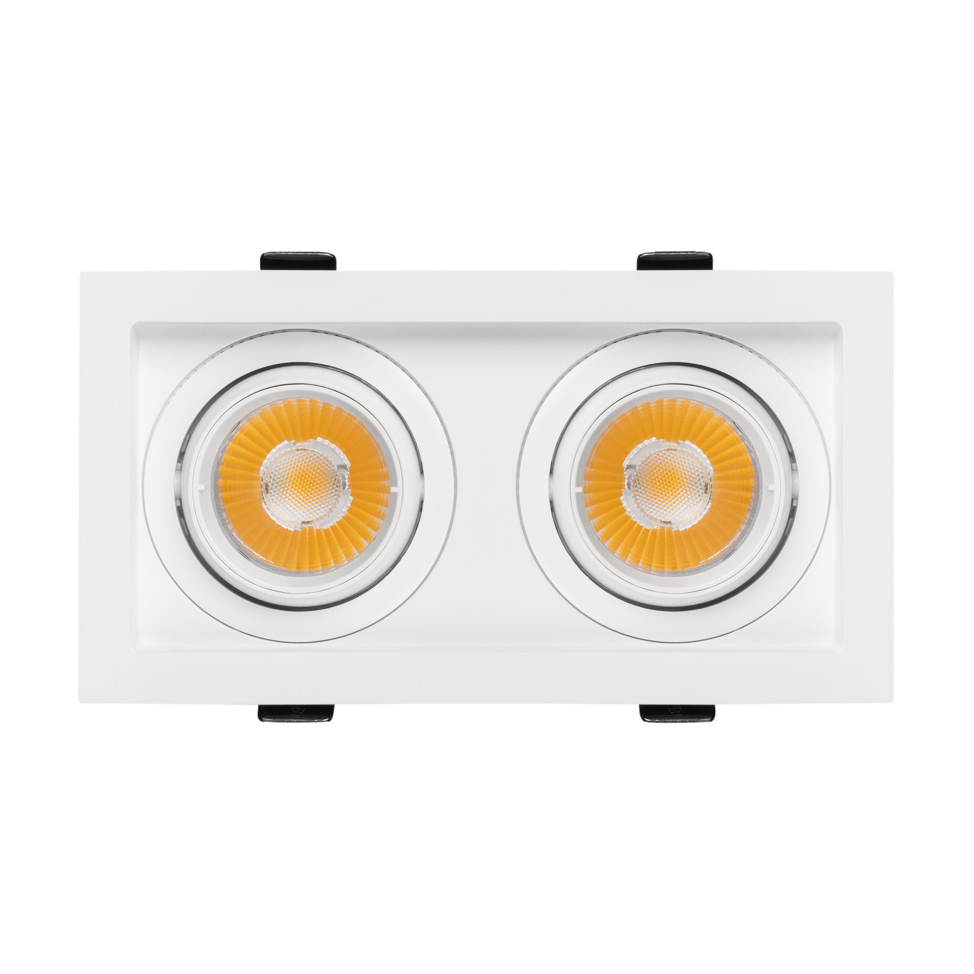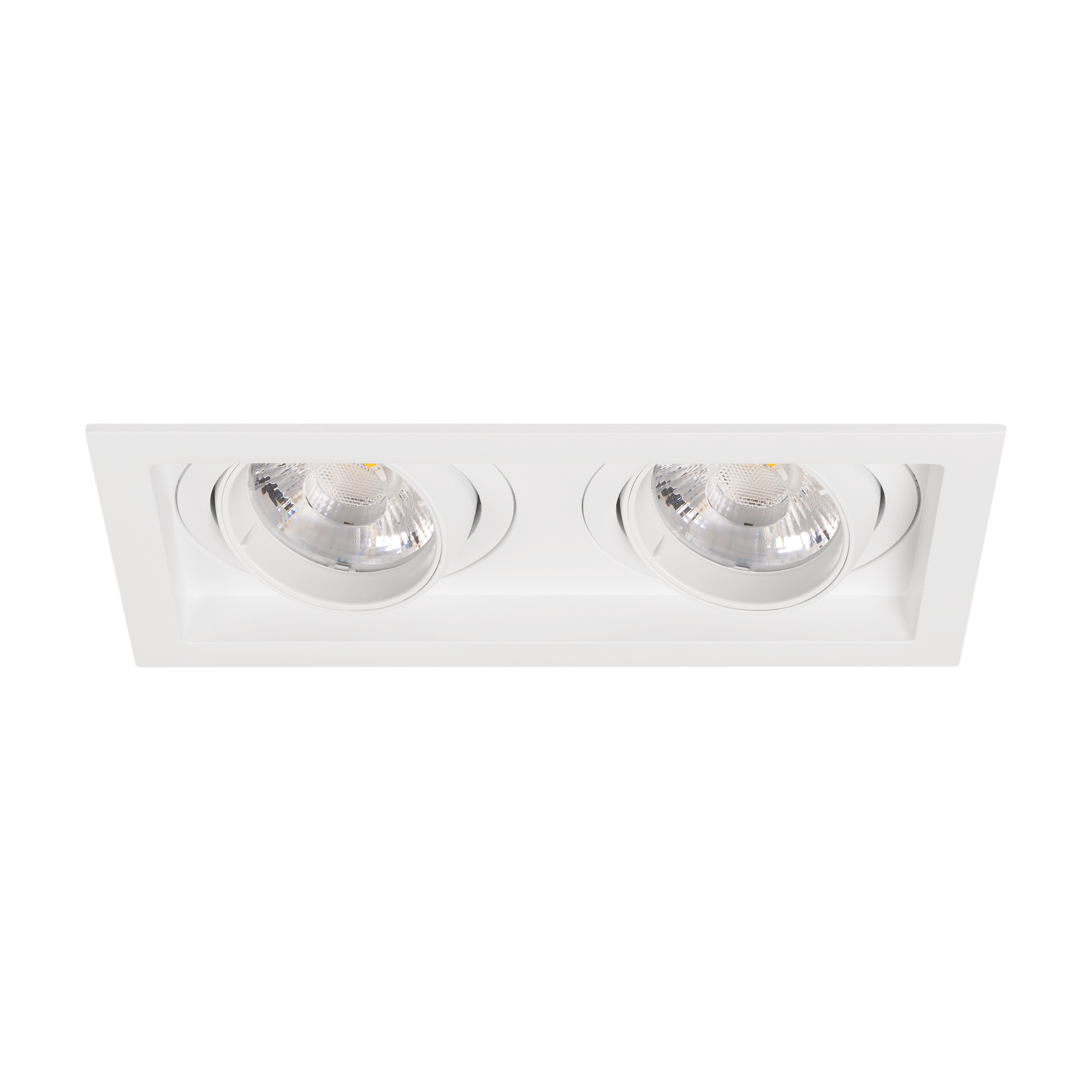 Встраиваемый карданный светильник. Мощность 2х12 Вт, св. поток 2636 лм, 109 лм/Вт, дневной 4000 K, CRI>92, угол 20°, напряжение питания 230 В. Белый корпус из алюминия, белая вставка, степень защиты IP20. Размер: длина 170 мм, ширина 90 мм, высота 80 мм. Монтаж встраиваемый, установочное отверстие: длина 155 мм, ширина 75 мм. Драйвер 27-40 В, 300 мА, пульсация <2%.