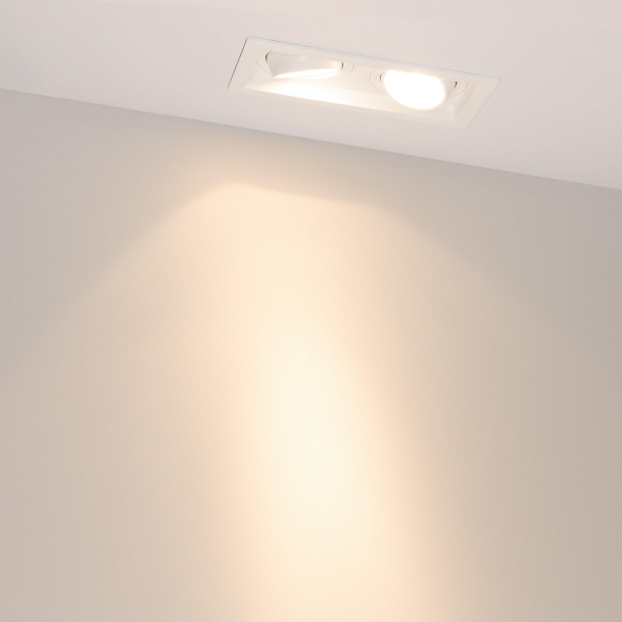 Встраиваемый карданный светильник. Мощность 2х12 Вт, св. поток 2636 лм, 109 лм/Вт, тёплый 3000 K, CRI>92, угол 20°, напряжение питания 230 В. Белый корпус из алюминия, белая вставка, степень защиты IP20. Размер: длина 170 мм, ширина 90 мм, высота 80 мм. Монтаж встраиваемый, установочное отверстие: длина 155 мм, ширина 75 мм. Драйвер 27-40 В, 300 мА, пульсация <2%.